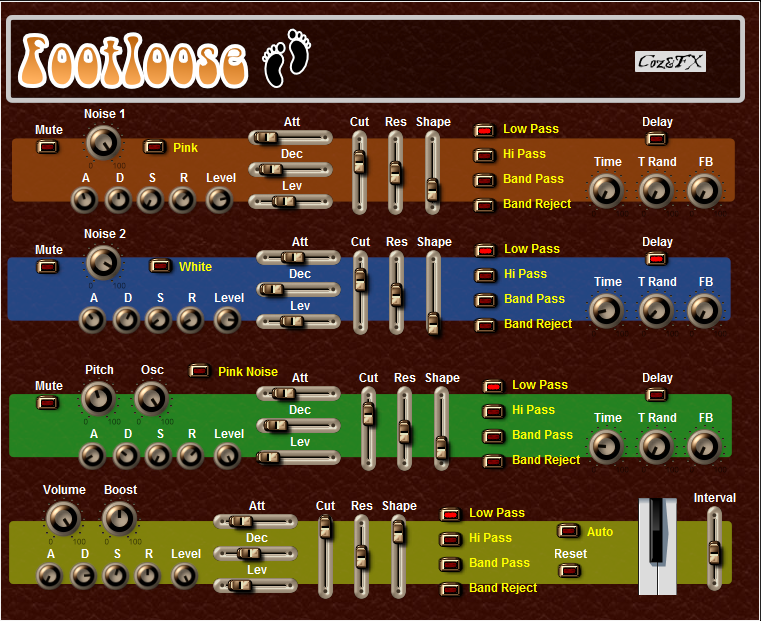 View full size Download VST Footloose is a synth that does one thing only - create footsteps. It plays the steps (with variations) constantly so you can make variations to the sound until they are right for your use. This allows me to create any number of variations of different types of footsteps for use alone, or in conjunction with other sound effects.